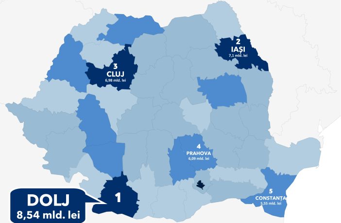 Județul Dolj ocupă prima poziție în privința valorii cumulate a proiectelor derulate cu fonduri europene aferente perioadei 2021 – 2027, după cum reiese dintr-o analiză elaborată de Ministerul Investițiilor și Proiectelor Europene (MIPE). Seria contractelor de finanțare semnate pentru investiții realizate în Dolj, care a fost deschisă de Consiliul Județean, cu demersul privind modernizarea drumului 641 Mischii – Pielești – Teslui – limita județului Olt, totalizează 8.540.224.993 de lei, echivalentul a 1,68 miliarde de euro, arată cifrele date publicității de MIPE. Județul își consolidează astfel performanțele din exercițiul financiar precedent,…