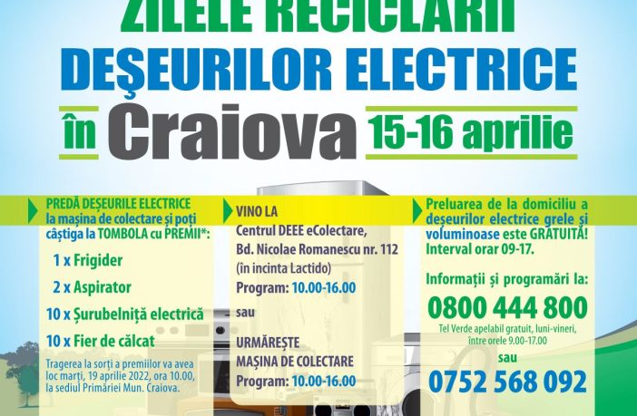 Primăria Municipiului Craiova, în parteneriat cu organizația ECOPOSITIVE și SC Ecotrans Danara SRL, organizează în perioada 15 – 16 aprilie 2022, o campanie de educare, informare și colectare gratuită a deșeurilor electrice și electronice. Astfel, craiovenii se vor putea programa în vederea preluării gratuite a deșeurilor de echipamente electrice și electronice, de către operatorul de colectare autorizat, la numerele de telefon: 0800444800 – Call Center sau 0752568092, de luni până vineri, între orele 09:00 – 17:00 și online pe www.colecteaza.ro. De asemenea, cetățenii vor avea la dispoziție și un punct…