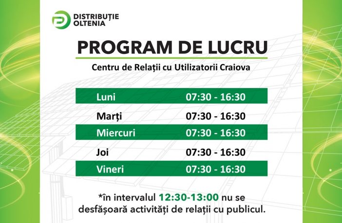 Centrele de Relații cu Utilizatorii Distribuție Oltenia situate în Pitești, str. Dârzu, nr. 1A, județul Argeș și Craiova, str. Calea Severinului, nr. 97, județul Dolj își prelungesc programul de lucru cu publicul, derulându-și activitatea cu utilizatorii de luni până vineri, în intervalul orar 07:30 – 16:30 (cu pauză de prânz între 12:30 – 13:00). Chiar și după schimbarea acționariatului, din 31.03.2021, operatorul Distribuție Oltenia rămâne preocupat în permanență pentru a identifica cele mai potrivite soluții pentru utilizatorii săi. Astfel, programul Centrelor de Relații cu Utilizatorii din Craiova și Pitești se…