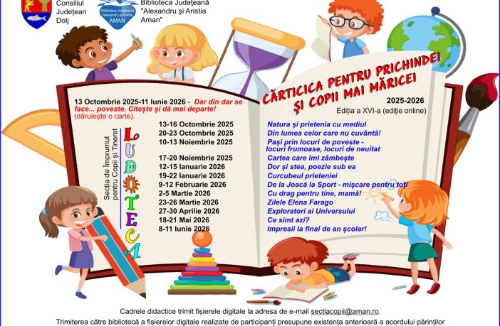 Biblioteca Județeană „Alexandru și Aristia Aman” organizează cea de-a XVI-a ediție (ediție online) a proiectului „Cărticica pentru prichindei și copii mai măricei”, proiect care se adresează preșcolarilor și elevilor din ciclul primar. Ediția de față este structurată în treisprezece teme, programate astfel: 3 octombrie 2025 – 11 Iunie 2026 – Dar din dar se face… poveste. Citește și dă mai departe! (dăruiește o carte). 13 – 16 octombrie – Natura și prietenia cu mediul (confecționarea unor colaje din frunze, flori uscate si/ sau materiale reciclabile) 20 – 23 octombrie – Din…