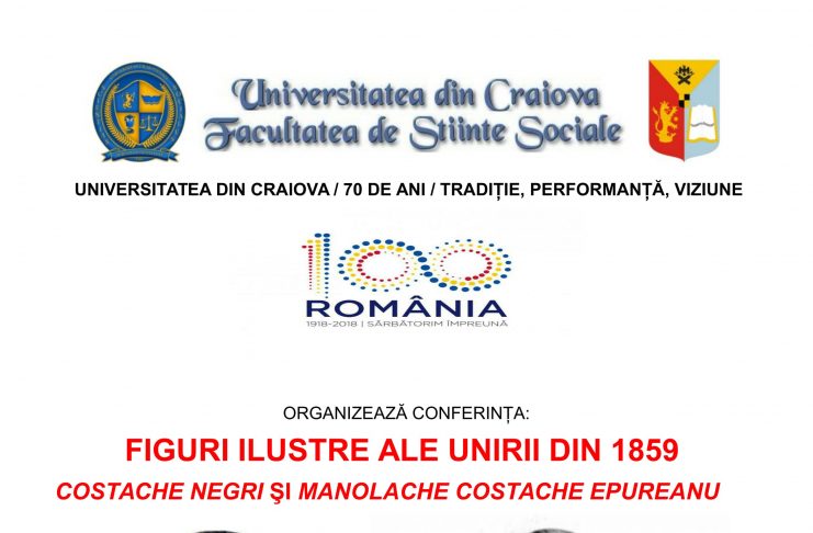 Facultatea de Ştiinţe Sociale a Universităţii din Craiova, sub egida manifestărilor „România – Centenar”, organizează conferinţa: Figuri ilustre ale Unirii din 1859: Costache Negri şi Manolache Costache Epureanu. Prelegerea va fi susţinută de prof.univ.dr.habil. Sorin Liviu Damean. Evenimentul va avea loc Marţi, 23 ianuarie 2018, ora 12.00, în Sala 444 (clădirea Rectorat a Universităţii din Craiova).