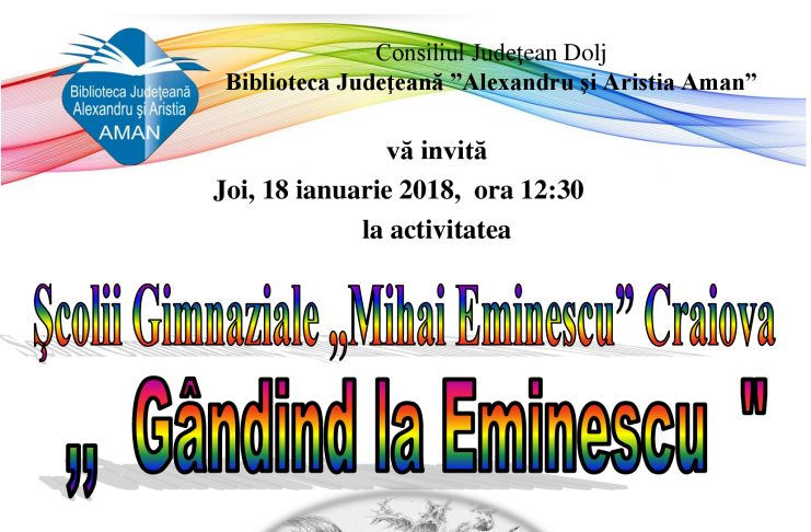 Biblioteca Județeană “Alexandru și Aristia Aman”, în parteneriat cu Școala Gimnazială “Mihai Eminescu”, organizează joi, 18 ianuarie, începând cu ora 12.30, în sala “Acad. Dinu C. Giurescu”, evenimentul “Gândind la Eminescu”. Construită în sensul cinsitirii poetului Mihai Eminescu, acțiunea reunește diverse concursuri interactive, dar și momente lirice, muzicale și coregrafice susținute de școlari și preșcolari de la doisprezece unități de învățământ din municipiul Craiova. Cu același prilej va fi organizată o expoziție de lucrări plastice. “Zeci de elevi și profesori vor fi prezenți la bibliotecă pentru a-l cinsti pe Mihai…