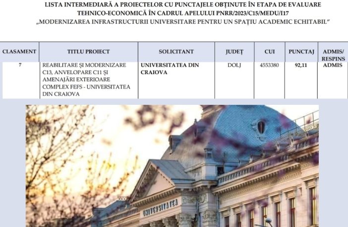 Proiectul propus de Universitatea din Craiova, care prevede modernizarea complexului Facultății de Educație Fizică și Sport (FEFS), se află pe lista granturilor finanțate de Ministerul Educației prin Planul Național de Redresare și Reziliență. Valoarea proiectului este de aproximativ 17 milioane de lei și presupune reabilitarea căminelor și a spațiilor de recreere din campusul Facultății de Educație Fizică și Sport. Astfel, toate camerele din campusul FEFS vor fi complet renovate și vor avea baie proprie. Totodată, vor fi amenajate și săli de lectură, de ultimă generație, pentru ca studenții să beneficieze…