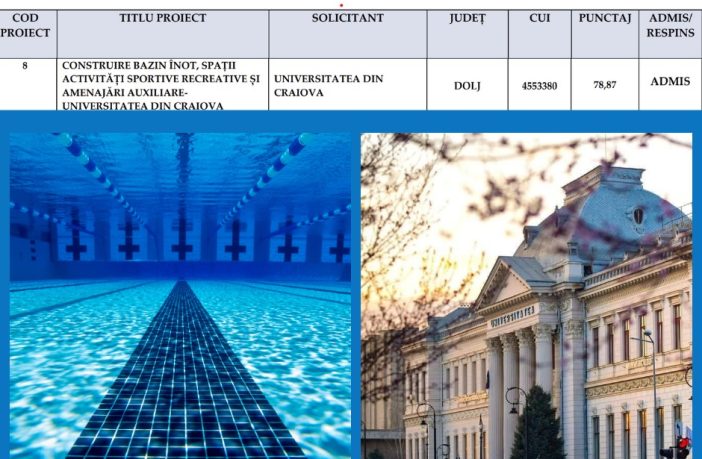 Proiectul Universității din Craiova „Construire bazin înot, spații activități sportive recreative și amenajări auxiliare” primește finanțare de la Ministerul Educației prin Planul Național de Redresare și Reziliență. Grantul, în valoare de opt milioane de euro, prevede construirea unui complex sportiv, în campusul Facultății de Educație Fizică și Sport, ce cuprinde două bazine de înot: unul olimpic și altul didactic și de antrenament. Bazinul de înot, de dimensiuni olimpice, va avea 50×25 metri, iar cel de pregătire va avea o suprafață de 25×12,5 metri. Construcția va fi organizată pe patru niveluri.…