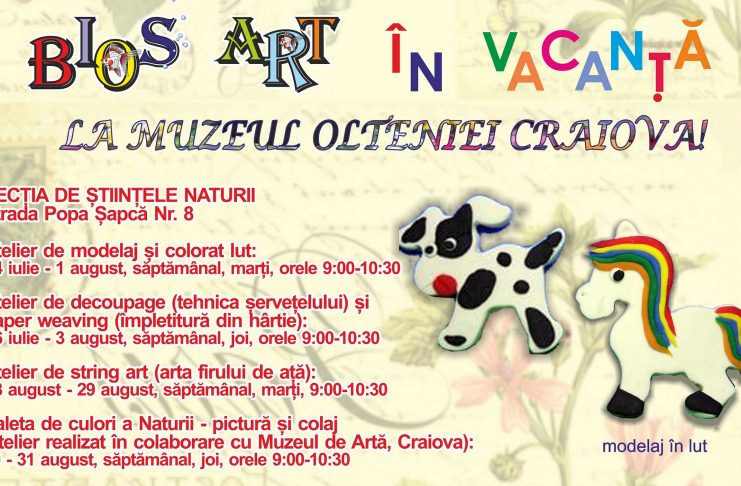 Pentru că e iulie, vreme de vacanță, Muzeul Olteniei Craiova organizează, cu sprijinul financiar al Consiliului Judeţean Dolj, ateliere cultural-educative dedicate copiilor, ateliere călătoare în lumea jocului și cunoașterii în cadrul cărora vom colinda cu gândul, sufletul şi mâinile creatoare ale celor mici, pe firul vorbei și creației pornind de la bunii şi străbunii noştri, poposind la povești despre dinozauri și arici, ajungând până la cunoaşterea cerului. Ne vom juca de-a Timpul, căci e vremea copilăriei şi a viselor vorbite în cadrul următoarele programe culturale, interactive: 1. Atelierele de meşteşuguri…
