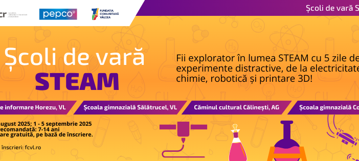 Fundația Comunitară Vâlcea anunță cu bucurie lansarea a patru Școli de Vară STEAM gratuite pentru copii, organizate în perioada 25 – 29 august, în localitatea Sălătrucel și în localitatea Horezu, în județul Vâlcea. În județul Argeș, școlile de vară se desfășoară la Călinești, în perioada 25 – 29 august și la Corbeni, în perioada 1 – 5 septembrie. Școala de vară de la Horezu se desfășoară în parteneriat cu Asociația Project IVI si grupul de inițiativă Digital Village. Activitățile sunt gândite să aprindă curiozitatea copiilor pentru știință, oferindu-le celor mici…