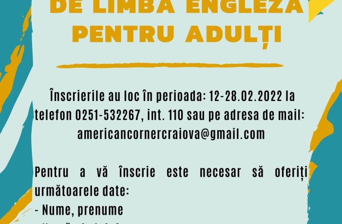 Biblioteca Județeană „Alexandru și Aristia Aman”, prin secția American Corner, organizează în perioada 01.02.2022 – 26.04.2022 cursuri gratuite de limba engleză, nivel începător și B1. Cursurile se adresează persoanelor cu vârsta cuprinsă între 25 – 55 de ani. Trainerul cursului va fi Ana Maria Demetrian, lector univ. dr. la Facultatea de Litere din cadrul Universității din Craiova și trainer în cadrul centrului de limbă engleză „Professor A’s International Academy”, pe care îl conduce. Întâlnirile vor avea loc în fiecare marți, la ora 17.30, pe platforma online Zoom. Înscrierile pentru cursul…