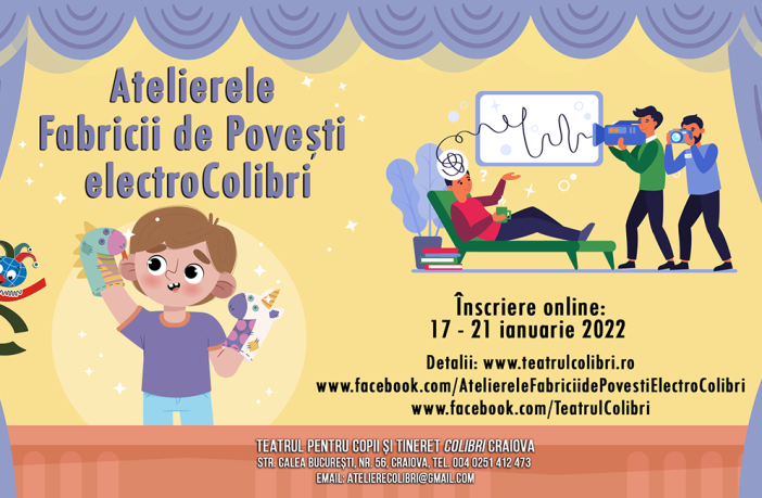 Înscrieri din 17 ianuarie 2022, ora 00:01! Teatrul Colibri Craiova organizează o nouă serie de ateliere de creație în perioada 31 ianuarie – 20 martie 2022. Preţul / atelier (întreaga perioadă) este 170 lei. O noutate, din această serie! Persoanele care se înscriu la 3 ateliere achită doar 2, unul fiind gratuit. Cei care optează pentru 4 ateliere, plătesc pentru 3 dintre ele. Înscrieri se fac în intervalul 17 – 21 ianuarie 2022, doar prin formular on-line, link-urile pentru fiecare atelier în parte fiind disponibile din 17 ianuarie, de la…