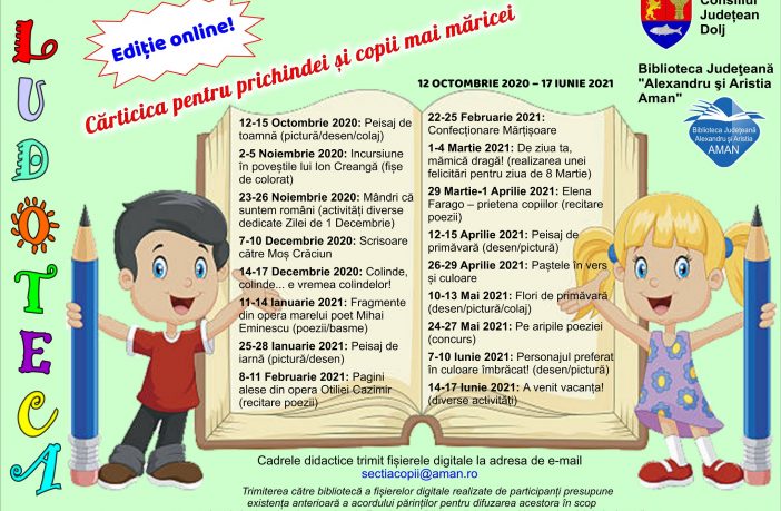Biblioteca Județeană „Alexandru și Aristia Aman” anunță lansarea celei de-a XI-a ediții a proiectului „Cărticica pentru prichindei și copii mai măricei”. Proiectul se adresează preșcolarilor și elevilor, clasele I-IV. Din motive obiective, toate activitățile proiectului se vor desfășura în mediul online. Structurată în șaptesprezece teme educaționale, ediția de față debutează luni, 12 octombrie 2020, și se desfășoară până joi, 17 iunie 2021. Toate activitățile planificate în cadrul temelor educaționale se desfășoară în afara spațiilor bibliotecii, respectiv la școală, la grădiniță sau la domiciliile participanților. În vederea înscrierii efective în cadrul…