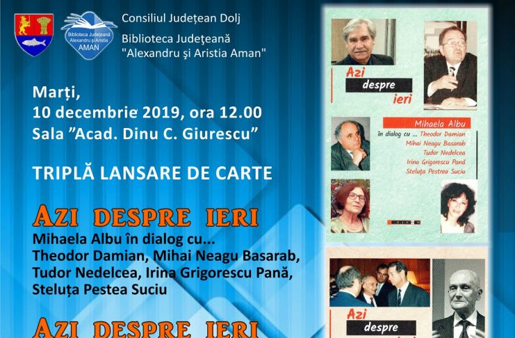 Biblioteca Județeană „Alexandru și Aristia Aman” găzduiește marți, 10 decembrie 2019, începând cu ora 12,00, în sala „Acad. Dinu C. Giurescu”, lansarea volumelor „Azi despre ieri… Mihaela Albu în dialog cu Theodor Damian, Mihai Neagu Basarab, Tudor Nedelcea, Irina Grigorescu Pană, Steluța Pestrea Suciu”, „Azi despre ieri… Mihaela Albu în dialog cu Dinu Zamfirescu”, ale autoarei Mihaela Albu, respectiv „Caiete Macedonskiene”, volumul 1, autor Ion Munteanu. Evenimentul va fi moderat de Valentin Ajder, directorul Editurii Eikon, și se va bucura de prezența scriitorilor Irina Macedonski, Mihaela Albu, Ioan Lascu, Tudor…