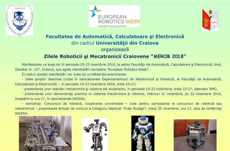 În perioada 19-23 noiembrie 2018, la Facultatea de Automatică, Calculatoare şi Electronică, Departamentul de Mecatronică şi Robotică organizează Zilele Roboticii şi Mecatronicii Craiovene „MEROB 2018”. Din seria de evenimente, amintim: Zilele porţilor deschise (vizite în laboratoarele Departamentului de Mecatronică şi Robotică, orele 10-17), prezentarea unor realizări mecatronice şi robotice ale studenţilor (laborator SMC), prezentarea unor demonstraţii practice cu sisteme mecatronice şi robotice (miercuri 21 noiembrie, joi 22 noiembrie 2018, începând cu ora 17, în laboratoarele INCESA). Sunt organizate şi workshop-uri şi concursuri de robotică, la MEROB 2018 – Zilele Roboticii şi…