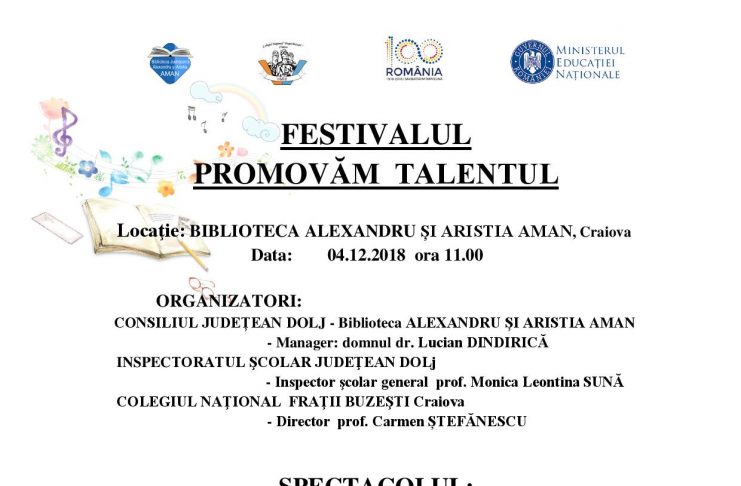 Biblioteca Județeană „Alexandru și Aristia Aman”, găzduiește marți, cu începere de la ora 11, în sala „Acad. Dinu C. Giurescu”, spectacolul „România Centenar”, la care vor participa peste 100 de elevi înscriși la școlile din Craiova și din județul Dolj. Spectacolul „România Centenar” face parte din seria manifestărilor incluse în programul Festivalului Județean „Promovăm talentul”, festival ajuns la cea de-a VIII-a ediție și organizat de Consiliul Județean Dolj, prin Biblioteca Județeană „Alexandru și Aristia Aman”, Inspectoratul Școlar Dolj și Colegiul Național „Frații Buzești” Craiova. Proiectul este coordonat de prof. Iuliana…