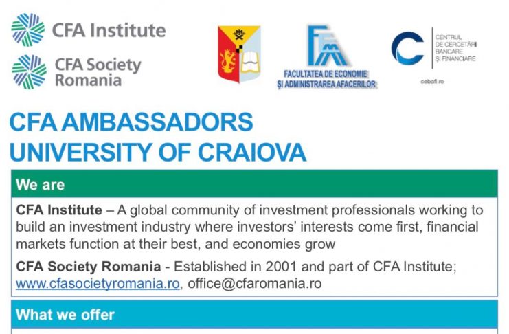 Chartered Financial Analyst Society (CFA) România, în parteneriat cu Centrul de Cercetări Bancare și Financiare (CEBAFI) și Facultatea de Economie și Administrarea Afacerilor, Universitatea din Craiova, organizează joi, 29 martie 2018, la sala 228 (sediul central al Universității din Craiova, str. A. I. Cuza, nr. 13), începând cu ora10.30, o întâlnire cu cadrele didactice și studenții economiști. Evenimentul, parte a programului CFA Ambassadors și a programului FEAA Educația financiară – provocări și soluții, se va desfășura în două etape: începând cu ora 10.30 are loc întâlnirea cu cadrele didactice ale…