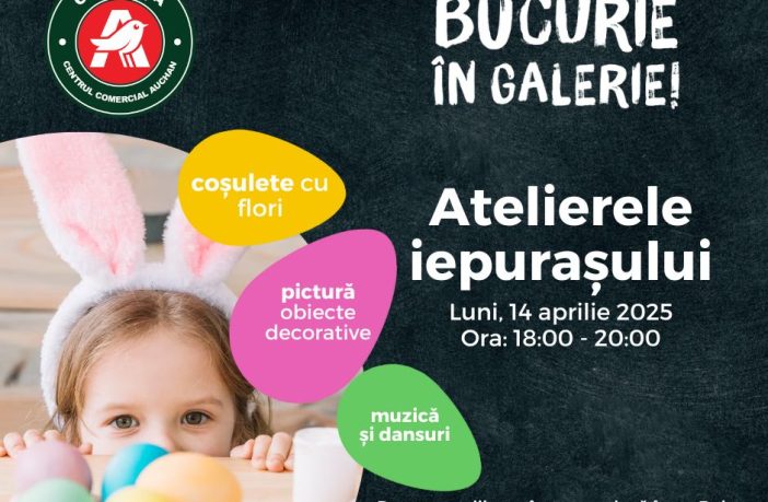 Copii, se strigă marea adunare la Centrul Comercial Auchan Craiovița! Luni, 14 aprilie 2025, între orele 18:00 și 20:00, vă asteptam la „Atelierele Iepurașului”. Invităm toți copiii cu vârste între 5 și 12 ani la un eveniment special, plin de creativitate și distracție . „Atelierele Iepurașului” sunt gândite pentru a le oferi celor mici un spațiu de joacă și învățare, unde se pot bucura de activități diverse, învățând noi tehnici de artizanat și dezvoltându-și imaginația. Micuții vor participa la: Aranjamente florale pentru masa de sărbătoare– o activitate care le va stimula creativitatea…