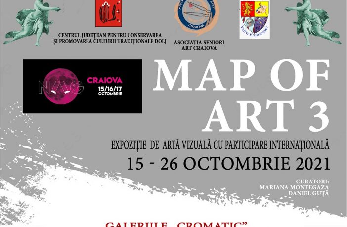 Centrul Judeţean pentru Conservarea şi Promovarea Culturii Tradiţionale Dolj, Asociația Seniori Art Craiova și Asociația „Arttrad“ Sebeș vă invită vineri, 15 octombrie 2021, ora 13:00, în Galeriile „Cromatic“, la vernisajul Expoziţiei de artă vizuală, cu participare internațională, „Map of ART 3“. Participă cu lucrări studenți și artiști plastici, membri U.A.P., din România, din orașele Craiova, Calafat, Râmnicu Vâlcea, Constanța, Tulcea, Arad, Alba Iulia, Sebeș, Cluj-Napoca, precum și artiști din Wellington – Marea Britanie și Gabon – Africa Centrală. Artiștii plastici, Mariana Montegaza și Daniel Guță, reprezentanții Asociației Seniori Art Craiova,…