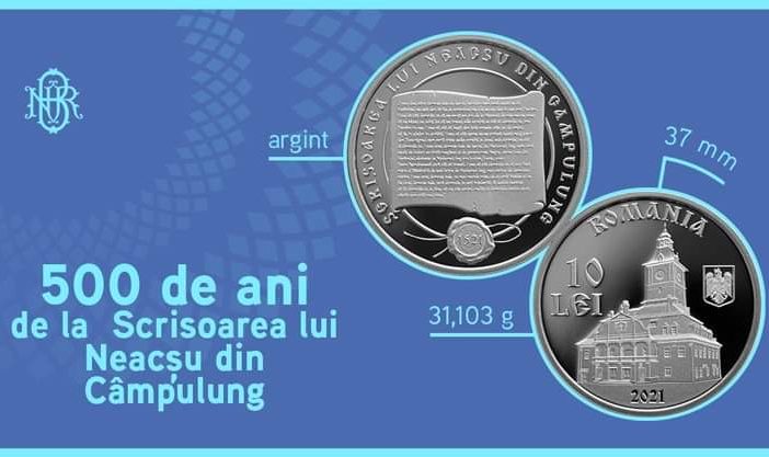 Începând cu data de 13 septembrie 2021, Banca Naţională a României va lansa în circuitul numismatic o monedă din argintcu tema 500 de ani de la Scrisoarea lui Neacșu din Câmpulung, cel mai vechi document păstrat scris în limba română. Aversul monedei redă o imagine a Casei Sfatului din Brașov, inscripția în arc de cerc „ROMANIA”, valoarea nominală „10 LEI”, stema României și anul de emisiune „2021”. Reversul monedei prezintă un fragment din textul Scrisorii luiNeacșu din Câmpulung, inscripția circulară „SCRISOAREA LUI NEACSU DIN CAMPULUNG” și anul „1521” plasat într-un sigiliu. Monedele din argint,…