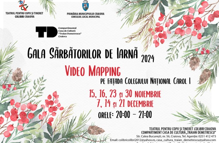 Teatrul pentru Copii și Tineret Colibri Craiova a pregătit publicului o invitație specială pentru vineri, 15 noiembrie 2024, la ora 20:00, în cadrul Târgului de Crăciun, la un spectacol de video mapping: o proiecție video de mari dimensiuni, realizată pe fațada Colegiului Național Carol I (strada Ion Maiorescu), cu tematică dedicată Crăciunului. Evenimentul este parte a ceremoniei de deschidere a Târgului de Crăciun, organizat de Primăria Municipiului Craiova. Proiecția video inspirată de frumoasa sărbătoare a Crăciunului va mai putea fi văzută pe fațada Colegiului Național Carol I în zilele de 16, 23…