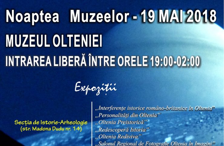 Muzeul Olteniei este unul dintre participanţii activi ai Ediției a XIV-a a evenimentului cultural “Noaptea Europeană a Muzeelor” (inițiat de către Ministerul Culturii și Comunicării din Franța), întâmpinându-şi vizitatorii în nocturnă cu un patrimoniu valoros şi diversificat, reprezentativ pentru dezvoltarea comunităţii locale, dar şi regionale, pe care îl va etala în toate cele trei locaţii expoziţionale din componența sa, respectiv: Secţia de Etnografie (str. Matei Basarab nr. 16), Secţia de Istorie-Arheologie (str. Madona Dudu nr. 14), Secţia de Ştiinţele Naturii (Str. Popa Şapcă nr. 8). Astfel, pe 19 mai, accesul…