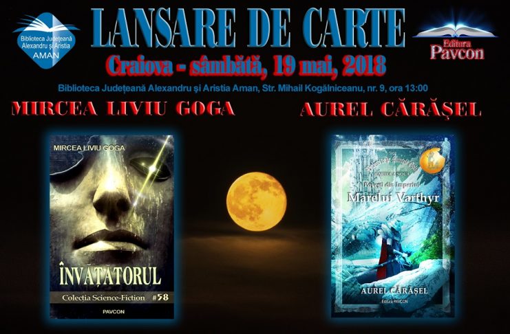 Biblioteca Județeană „Alexandru și Aristia Aman” organizează sâmbătă, 19 mai 2018, ora 13.00, în sala „Academician Dinu C. Giurescu”, o dublă lansare de carte: volumul cu numărul9 din ciclul de volume fantasy „Povești de pe muntele Golia”, de Aurel Cărășel și volumul de povestiri „Învățătorul” de Mircea Liviu Goga, ambele publicate de Editura Pavcon, din București. Aurel Cărășel a condus cenaclurile „Henri Coandă“ și „Asociația Creatorilor de SF”, ambele din Craiova și „Atlantis-Club“ din Cernavodă. În vara anului 1989, împreună cu Alexandru Mironov și Sorin Repanovici, a fondat tabăra de…