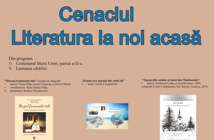 Biblioteca Județeană „Alexandru și Aristia Aman” găzduiește luni, 14 mai 2018, la ora 16.30, în sala „Academician Dinu. C. Giurescu”, ședința lunară a Cenaclului „Literatura la noi acasă”. Întâlnirea de astăzi a Cenaclului va beneficia de prezența următorilor invitați: prof.Titi Vasile Titu, Gheorghe Duduială, viceședintele PNȚCD Dolj, scriitoarea Rodica Nicoleta Ion, cititoarea Viky Victoria Preoteșescu, scriitoarea Cornelia Georgescu, blogger si kinetoterapeut Adrian Sora ș.a. Ședința va fi moderată de poeta Cristina Balasoiu, președinte al Cenaclului „Literatura la noi acasă”. Programul sedinței conține partea a doua a „Centenarului Marii Uniri” și…