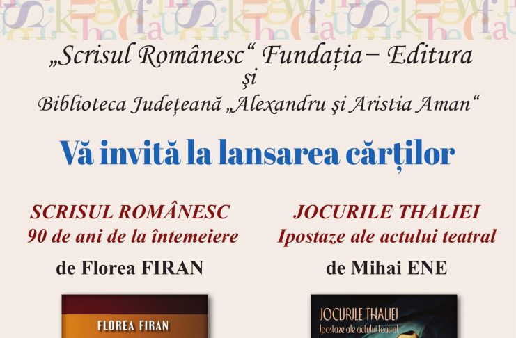 Biblioteca Județeană „Alexandru și Aristia Aman” găzduiește joi, începând cu ora 18.00, în sala „Acad. Dinu C. Giurescu” o dublă lansare de carte. În prezența invitaților Mihai Duțescu, Andreea Ghiță, Cătălin Ghiță, Ioan Lascu, Petrișor Militaru, Haricleea Nicolau, George Popescu, vor fi lansate volumele „Scrisul Românesc – 90 de ani de la întemeiere”, de Florea Firan și „Jocurile Thaliei” de Mihai Ene. Moderatorul acestei duble lansări de carte va fi scriitorul Florea Firan. Volumul „Scrisul românesc – 90 de ani de la întemeiere”, de FloreaFiran, este o lucrare de mari…
