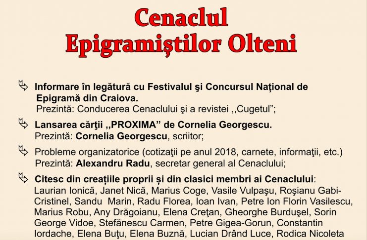 Biblioteca Județeană „Alexandru și Aristia Aman” găzduiește vineri, 4 mai 2018, la ora 15.00, în sala „Academician Dinu. C. Giurescu”, ședința lunară a Cenaclului Epigramiștilor Olteni. În cadrul ședinței, membrii din conducerea Cenaclului și a revistei „Cugetul” vor oferi detalii referitoare la Festivalul și Concursul Național de Epigramă din Craiova. De asemenea, vor fi abordate mai multe probleme organizatorice, printre care cotizațiile pentru anul 2018, carnetele de membru, alte subiecte diverse. Informațiile vor fi oferite deAlexandru Radu, secretar general al Cenaclului. Un moment important în cadrul sedinței va fi lansarea cărții „Proxima”,…