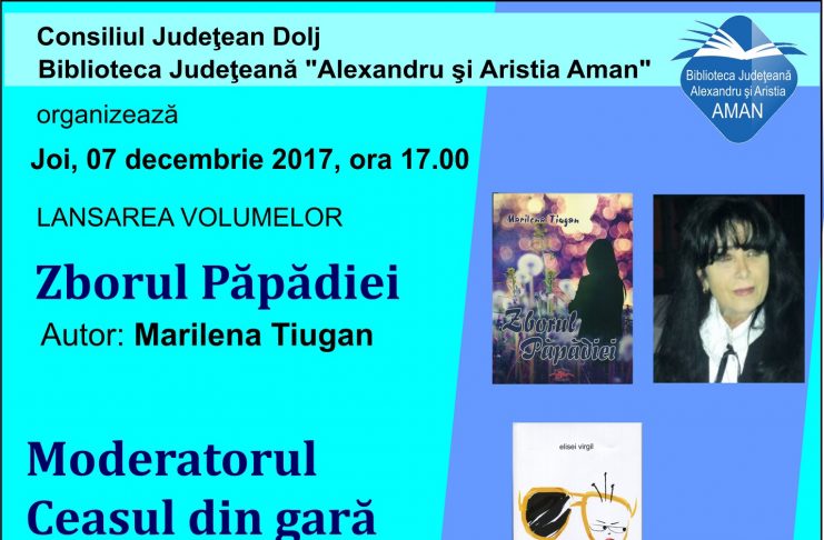 Joi, 7decembrie, începând cu orele 17,00, Biblioteca Județeană “Alexandru și Aristia Aman” organizează lansarea volumelor „Zborul păpădiei”, autor Marilena Tiugan, și „Mod-eratorul”, “Ceasul din gară”, “Triunghiul fericirii”, “Unghiul cu vârful rotund”, autor Elisei Virgil. Autoare a șase cărți de poezie și proză, Marilena Tiugan va prezenta „Zborul păpădiei”, un roman exploziv, cu scene desprinse din realitate, scris pe parcursul a patruzeci de zile. O carte „dictată”. Fabuloasă. Cu un stil aparte, în forță, cuvintele de ordine fiindintrospecție și suspans. Virgil Elisei va lansa în fața publicului romanele „Ceasul din gară”,…