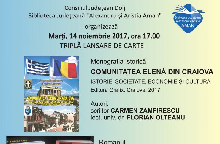 Marți, 14 noiembrie, începând cu orele 17,00, Biblioteca Județeană “Alexandru și Aristia Aman” organizează lansarea volumelor: “Comunitatea elenă din Craiova – Istorie, Societate, Economie și Cultură”, autori:Carmen Zamfirescu si Florian Olteanu și ”Dragoste cu iz de ciocolată”, volumele II-III, autor Carmen Zamfirescu. Invitați: – Ion Vasoyanis, Președintele Comunității Elene din Craiova; – Haris Papalitsas, antreprenor; – Petre Gigea-Gorun, ambasador, scriitor, Președintele Cenaclului Epigramiștilor Olteni; – Lect.univ.dr. Liviu Marius Ilie, Prodecan, Facultatea de Științe Sociale, Universitatea din Craiova; – Daniela Predoană, Director al Editurii ”Grafix” din Craiova; – Dumitru Serafim, colonel…
