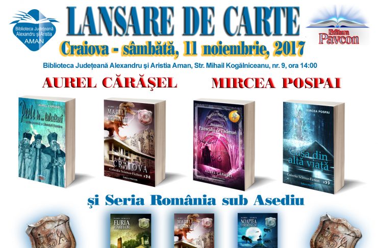 Biblioteca Județeană “Alexandru și Aristia Aman” organizează sâmbătă, începând cu ora 14.00, lansarea volumelor: “Perle de (in)cultură – O istorie (comică) a Literaturii Române”, respectiv “Poveștile Paznicului de Tărâmuri”, autor Aurel Cărășel și “Casa din altă viață”, autor Mircea Pospai. De asemenea, vor fi lansate și la Craiova primele trei volume din seria distopică ”România sub Asediu”. Este vorba despre volumele: “Furia Fiarelor – Focșani”,autor Florin Purluca, “Marile Migrații – Craiova”, de Aurel Cărășel și “Noaptea Lemurienilor – Focșani”, autor Florin Giurcă. Aurel Cărășel a absolvit Facultatea de Filologie din…