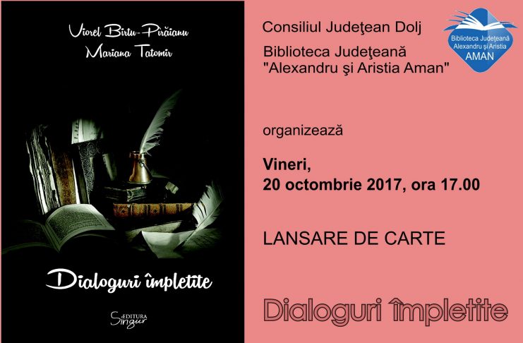 Biblioteca Județeană “Alexandru și Aristia Aman” va fi, vineri, începând cu ora 17.00, gazda unor „Dialoguri Împletite”, ale autorilor Viorel Birtu-Pîrăianu și Mariana Tatomir. La eveniment vor lua parte: Dan Lupescu; Lavinia Pintea Tatomir; Cătălin Miculeasa, student, Facultatea de Actorie; Costinela Ungureanu, student, Facultatea de Actorie. Marturisirile celor doi autori constituie o frumoasă invitație la lectură: „O intâlnire neașteptată în lumea virtuală între două persoane mature: un poet, care prin harul sau divin a creat o lume perfecta a iubirii și o cititoare pasionată de poezie, au facut posibila apariția…
