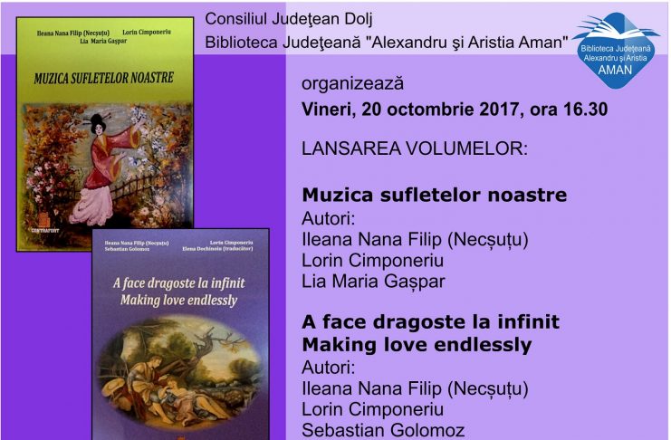 Biblioteca Județeană “Alexandru și Aristia Aman” organizează vineri, 20 octombrie 2017, începând cu ora 16.30, lansarea următoarelor cărți: 1. “Muzica sufletelor noastre”, autori Ileana Nana Filip (Necșuțu), Lorin Cimponeriu și Lia Maria Gașpar; 2. “A face dragoste la infinit/Making love endlessly”, autori: Ileana Nana Filip (Necșuțu), Lorin Cimponeriu, Sebastian Golomoz și Elena Dochinoiu (traducător); 3. “Avantajele utilizării parteneriatului public-privat în domeniul asistenței sociale”, autor Ileana Nana Filip (Necșuțu); 4. “Despre copii, bătrâni și persoane cu boli terminale, sărăcie”, autor Ileana Nana Filip (Necșuțu). La eveniment vor participa: – Gheorghe Sinescu,…