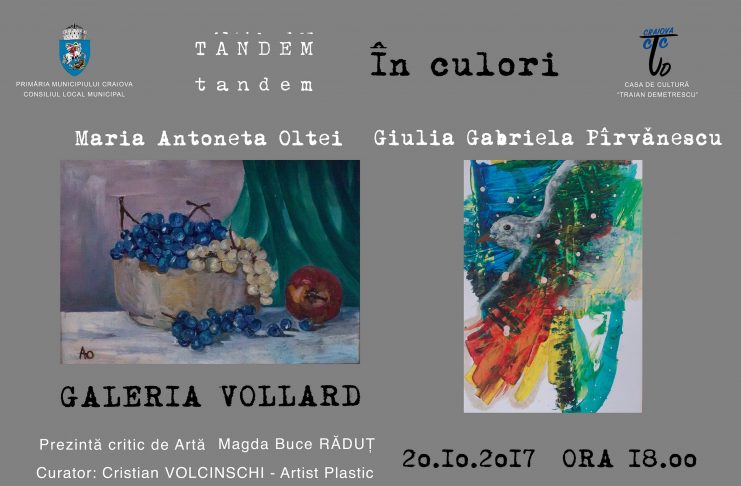 Vineri, începând cu ora 18:00, Casa de Cultură „Traian Demetrescu” organizează expozţia Tandem în culori, în cadrul Galeriei Vollard. Expun artiştii plastici Giulia Gabriela Pîrvănescu şi Maria Antoneta Oltei. Giulia Gabriela Pîrvănescu este la prima expoziţie personală cu lucrări realizate în diverse tehnici ale artelor plastice şi decorative (pictură în culori acrilice, desen în creion, colaj etc.) Maria Antoneta Oltei expune pictură realizată în culori de ulei pe pânză, în manieră realistă cu influenţe expresioniste, abordând o tematică diversă.