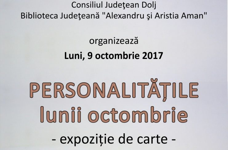 Luni, 9 octombrie 2017, Biblioteca Județeană „Alexandru și Aristia Aman” vă invită la deschiderea expoziției de carte „Personalitățile lunii octombrie”. Vor fi expuse scrieri despre, sau ale următorilor autori: Dimitrie Cantemir, Simion Mehedinți, Ștefan Petică, Mihail Sadoveanu, Agatha Grigorescu-Bacovia, Zaharia Stancu, Mircea Vulcănescu, Cella Serghi. Prin această expoziție de carte se dorește trecerea în revistă a operelor unor personalități marcante ale țării noastre. Dintre titlurile expuse menționăm: 1 Vulcănescu, Mircea, Cuvinte pentru fratele rămas departe (material printat + documentar audio), Societatea Română de Radiodifuziune, București, 2004; 2 Cantemir, Dimitrie, Opere,…