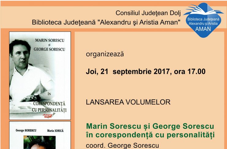 Joi, 21.09.2017, începând cu ora 17.00, Biblioteca Județeană “Alexandru și Aristia Aman” vă invită să luați parte la lansarea volumelor “Marin Sorescu și George Sorescu în corespondență cu personalități”, coordonator George Sorescu, “Marin Sorescu. Scrisori și documente inedite”, vol. 1, autori George Sorescu și Emil Istocescu și“Marin Sorescu în documente inedite”, vol. 2, autori George Sorescu și Maria Ionică. Volumele vor fi prezentate de George Sorescu. George Sorescu s-a născut în anul 1927, în Comuna Bulzești din județul Dolj, într-o familie cu înclinații literare. A urmat clasele primare în comuna…