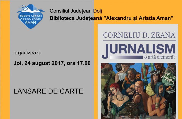 Joi, 24.08.2017, începând cu ora 17.00, Biblioteca Județeană “Alexandru și Aristia Aman” vă invită să luați parte la lansarea volumului Jurnalism. O artă efemeră?, autor Corneliu D. Zeana. Născut la data de 11 aprilie 1939 la Râmnicul Vâlcea, autorul și-a făcut debutul editorial cu poezia Măiastra, pe care a publicat-o în revista Pentru Patrie. A mai publicat Trei secole după Milescu. Jurnal paralel, Nu trădați, vă rog!, Alternanțe, Mistuire, Sănătate și comportament, Umoristice etc. Evenimentul se va desfășura în Sala “Dinu C. Giurescu”.