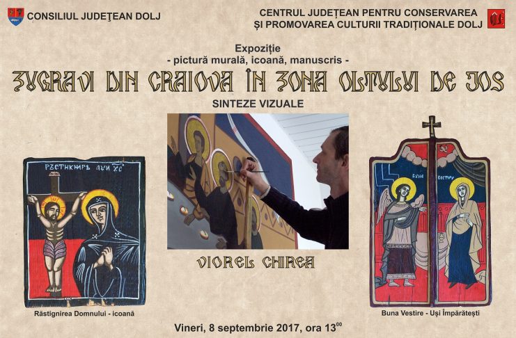 Consiliul Judeţean Dolj şi Centrul Judeţean pentru Conservarea şi Promovarea Culturii Tradiţionale Dolj vă invită vineri, 8 septembrie 2017, ora 13:00, la vernisajul Expoziției „Zugravi din Craiova în zona Oltului de Jos“ – Sinteze vizuale, semnată Viorel Chirea. „Zugravi din Craiova în zona Oltului de Jos este încercarea timidă, dar susținută, a Centrului Județean pentru Conservarea și Promovarea Culturii Tradiționale Dolj de a aborda o problematică mai puțin explorată. Expoziția de la Galeriile „Cromatic“ este o sinteză a eforturilor de ani ale artistului Viorel Chirea, în care lumea laică și cea…