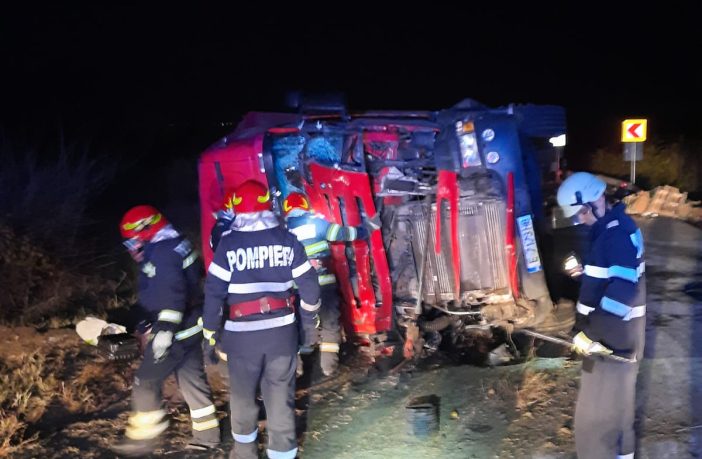 Un TIR s-a răsturnat, în această seară, între localitățile doljene Toceni și Căciulătești. Conducătorul auto, în vârstî de 71 ani, a rămas încarcerat. La locul evenimentului s-au deplasat o autospeciala de lucru cu apa si spuma, o ambulanta SMURD, o autospeciala de descarcerare și un echipaj SAJ. Din păcate, eforturile depuse de către salvatori au fost în zadar, șoferul fiind declarat decedat. În cauză s-a dispus efectuarea unei expertize legale pentru a se constatat cauza decesului.
