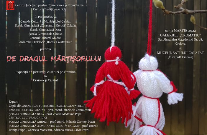 Centrul Judeţean pentru Conservarea şi Promovarea Culturii Tradiţionale Dolj celebrează luna mărțișorului și începutul primăverii prin două expoziții deschise deopotrivă la Craiova, în Galeriile „Cromatic“, și la Calafat, în perioada 01 – 31 martie 2022. Expoziția de pictură și cusături pe etamină „De dragul mărțișorului“ este realizată în parteneriat cu Casa de Cultură a Municipiului Calafat (prof. coord. Marinela Carauleanu), copiii din Ansamblul folcloric „Rozele Calafatului“, Școala Gimnazială Desa (prof. coord. Mădălina Popa); Centrul Cultural Ghidici; Școala Gimnazială Ghidici (prof. coord. Mihaela Carmen Nacu); Școala Gimnazială „Constantin Gerotă“ Calafat (prof.…