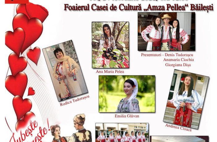 Centrul Judeţean pentru Conservarea şi Promovarea Culturii Tradiţionale Dolj se alătură din nou Casei de Cultură „Amza Pellea“ din Băilești și celebrează prin cântec și joc popular Dragobetele, sub genericul „Sărbătoarea iubirii la români“, joi, 24 februarie 2022, ora 12:00. Spectacolul folcloric se va desfășura în foaierul Casei de Cultură „Amza Pellea“ din Băilești și va fi susținut de Rodica Tudorașcu, Ana Maria Pelea, Emilia Glăvan, Andreea Cioacă, Ansamblurile folclorice „Bobocica“ și „Hora Moțățeiului“. Prezentatorii evenimentului sunt: Denis Tudorașcu, Anamaria Ciochia, Giorgiana Dișa. De peste 10 ani, Centrul Judeţean pentru…