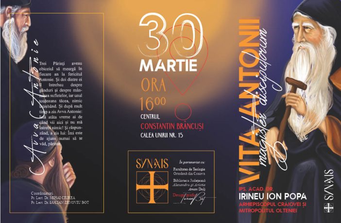 Facultatea de Teologie Ortodoxă din Craiova, în parteneriat cu Biblioteca Județeană „Alexandru și Aristia Aman” Dolj, organizează joi, 30 martie 2023, la Centrul Constantin Brâncuși din Craiova, începând cu ora 16, al treilea atelier de lectură Synaxis dedicat Paternității și uceniciei, intitulat „Vita Antonii – magister discipulorum”. Prelegerea va fi susținută de Înaltpreasfințitul Părinte Acad. dr. Irineu Ion Popa, Arhiepiscopul Craiovei și Mitropolitul Olteniei, fiind axată pe celebra scriere hagiografă Viața Sfântului Antonie. Conferința își propune să pună în relație dimensiunea formatoare a scrierii și continuitatea spirituală a oricărei Vieți. Atelierul…