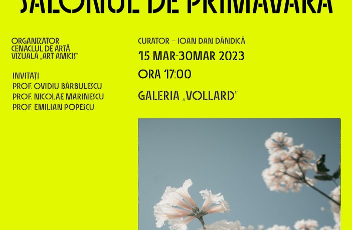 Casa de Cultură „Traian Demetrescu”, Craiova, vă invită miercuri, 15 martie 2023, ora 17:00 la Galeria de Artă „Vollard” (str. Traian Demetrescu, nr.31), unde va avea loc vernisajul expoziției de artă vizuală „Salonul de Primăvară”. Expoziția va fi deschisă până pe 30 martie. Expun artiștii: Anuca Maria Andrei-Balaure, Dan Băndică, Robert Cîrstoiu, Anamaria Cîrlig, Carla Lucia Chirvăsuță, Maria Gașpar, Florin Grădinaru, Theodor-Andrei Ghenoiu, Cecilia Găinaru, Rody Jotcar, Gheorghe Lazăr, Mihnea Marin, Maria Mihaela Matei, Teodora Ștefania Popescu, Maria Adriana Preda, Gabriela Rădulescu, Dana Rogobete, Monica Ristică, Constanța-Mădălina Ruican, Nela Marinela…