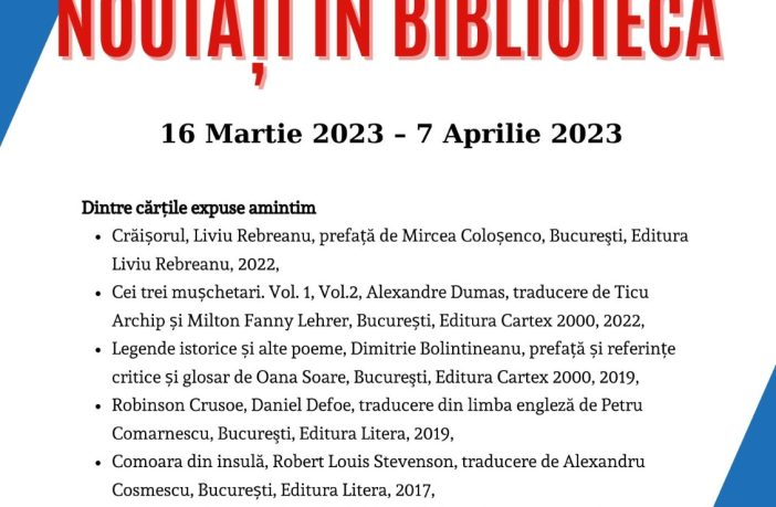 Biblioteca Județeană „Alexandru și Aristia Aman”, prin Secția Depozit General și săli de lectură, organizează expoziția intitulată „Noutăți în bibliotecă”. Expoziția este disponibilă în holul de la parterul instituției, în perioada 16 martie – 7 aprilie 2023. Dintre cărțile expuse amintim: – Crăișorul, Liviu Rebreanu, prefață de Mircea Coloșenco, Bucureşti, Editura Liviu Rebreanu, 2022, – Cei trei mușchetari. Vol. 1, Vol.2, Alexandre Dumas, traducere de Ticu Archip și Milton Fanny Lehrer, București, Editura Cartex 2000, 2022, – Legende istorice și alte poeme, Dimitrie Bolintineanu, prefață și referințe critice și glosar…
