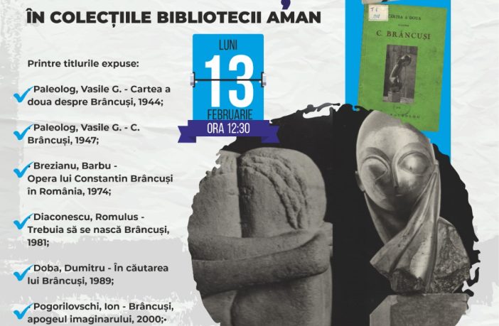 Biblioteca Județeană „Alexandru și Aristia Aman” invită publicul să participe la vernisajul expoziției „Constantin Brâncuși în colecțiile Bibliotecii Aman”, care va avea loc luni, 13 februarie, ora 12.30, în Salonul Expozițional din clădirea Aman. Expoziția va fi deschisă publicului până la finalul lunii februarie și va fi însoțită de o prezentare multimedia a titlurilor existente în colecțiile bibliotecii. Expoziția propune o serie de titluri între care menționăm: – Paleolog, Vasile G. – Cartea a doua despre Brâncuși, 1944, – Paleolog, Vasile G. – C. Brâncuși, 1947, – Brezianu, Barbu –…