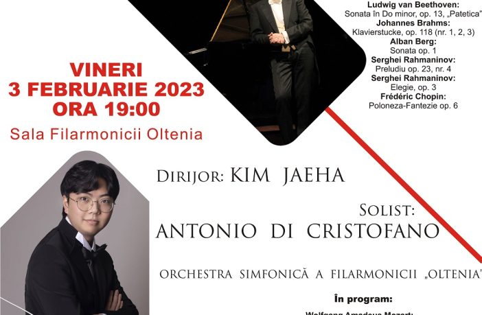 Filarmonica Oltenia Craiova invită publicul la două evenimente muzicale cu participarea pianistului italian Antonio Di Cristofano care va oferi un recital cu program preponderent clasic-romantic – miercuri, 1 februarie, ora 19:00. Vineri, 3 februarie, tot de la ora 19:00 – alături de Orchestra Simfonică dirijată de Kim Jae-Ha (Coreea de Sud) – Antonio Di Cristofano va interpreta Concertul nr. 20 pentru pian de MOZART prefațat de uvertura operei Nunta lui Figaro. Seara se va încheia cu Simfonia nr. 4, „Italiana”, compusă de Felix Mendelssohn-Bartholdy în timpul unei călătorii în Italia. Kim…