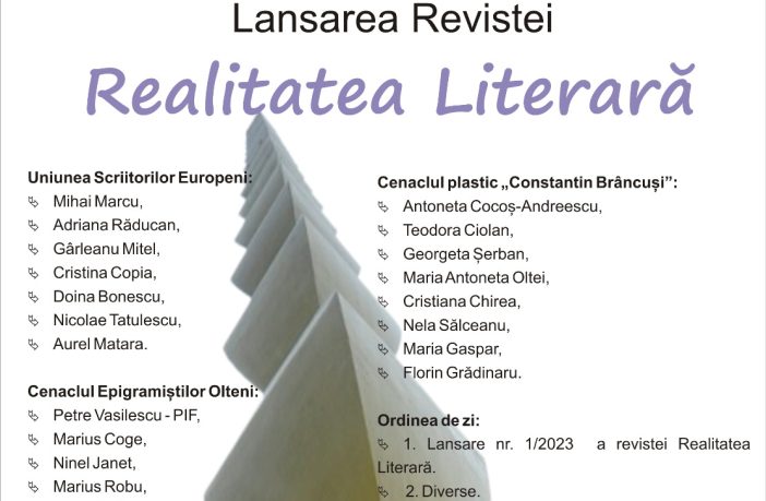 Biblioteca Județeană găzduiește marți, 31 ianuarie, începând cu ora 14,00 lansarea numărului 1/2023 a Revistei „Realitatea Literară”, Revistă a Uniunii Scriitorilor Europeni pentru promovarea literaturii române contemporane. Evenimentul este organizat de Uniunea Scriitorilor Europeni, Cenaclul Epigramiștilor Olteni, și Cenaclul Plastic „Constantin Brâncuși” din Craiova și va fi moderat de Ion Dascălu. La eveniment participă invitații: Mihai Marcu, Adriana Răducan, Gârleanu Mitel, Cristina Copia, Doina Bonescu, Nicolae Tătulescu, Aurel Matara, Petre Vasilescu- PIF, Marius Coge, Ninel Janet, Marius Robu, Cornelia Georgescu, Nana Necșutu, Antoneta Cocoș-Andreescu, Teodora Ciolan, Georgeta Șerban, Maria Antoneta…