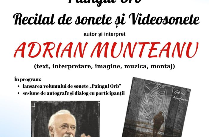 Biblioteca Județeană organizează joi, 26 ianuarie, începând cu ora 17.00, în sala „Acad. Dinu C. Giurescu”, lansarea volumului de sonete „Paingul Orb”, precum și recitalul de sonete și videosonete ce îl au drept autor pe Adrian Munteanu. Adrian Munteanu este poet, prozator, actor, performer, membru al Uniunii Scriitorilor din Romania. A jucat în numeroase piese de teatru și recitaluri de poezie, a regizat spectacole, a scris scenarii. În palmares s-au adunat 21 de premii naționale de interpretare, regie sau creație literară. Ca scriitor, în volum a debutat cu trei cărți de basme în versuri, „Seri…