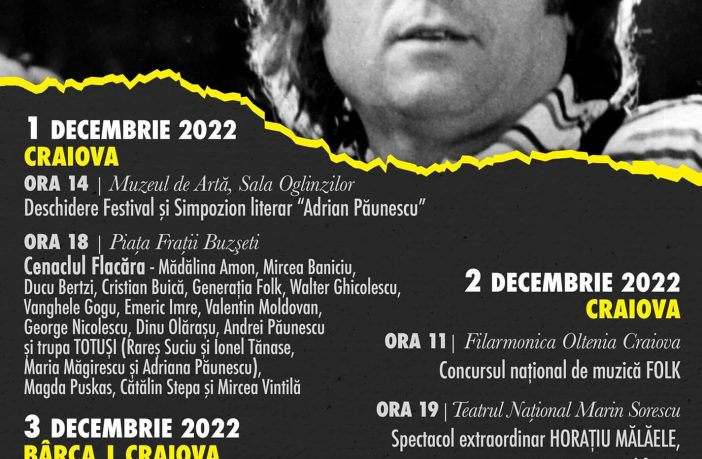 Muzica și poezia își dau, din nou, întâlnire la Craiova, la început de decembrie. Cei mai îndrăgiți artiști folk din țară deschid joi, 1 decembrie 2022, cea de-a VIII-a ediție a Festivalului Internațional Adrian Păunescu. Organizat de Fundația Culturală Iubirea și Primăria Craiova, festivalul îi readuce, în fața publicului, pe Ducu Bertzi, Mircea Vintilă, Mircea Baniciu, Andrei Păunescu și trupa TOTUȘI, Mădălina Amon, Magda Pușkaș, Cristian Buică, Valentin Moldovan, Emeric Imre, Cătălin Stepa, George Nicolescu, Dinu Olărașu, Vanghele Gogu, Walter Ghicolescu și Generația Folk. Spectacolul începe la ora 18.00 și…