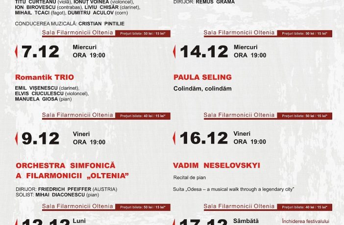 Festivalul Internațional ”Craiova Muzicală”, ajuns anul acesta la ediția 49, propune o călătorie sonoră alături de artiști reputați din Austria, Ucraina, Elveția Și România. Vor avea loc 8 concerte și recitaluri de factură diversă, de la vocal-simfonic, la muzică de cameră, rock simfonic și colinde. Festivalul va începe în data de 5 decembrie 2022, ora 19:00, cu Octetul Filarmonicii Oltenia Craiova condus de violonistul Cristian Pintilie, care va interpreta muzica melodioasă scrisă de Franz Schubert. Vineri, 9 decembrie, dirijorul austriac Friedrich Pfeiffer, pianistul craiovean Mihai Diaconescu și Orchestra simfonică vor…