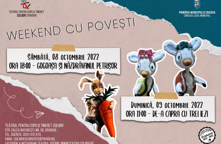 Așteptăm cu nerăbdare întâlnirea cu publicul și călătoria prin lumea poveștilor ce vor ocupa scena Teatrului pentru copii și tineret Colibri Craiova în acest week-end. Sâmbătă, 08 octombrie 2022, la ora 18:00 vom afla ce-i cu „Gogoașa și Năzdrăvanul Petrișor“, în spectacolul-coupé, adaptare după povești populare rusești, cu scenariul și regia de Alla Cebotari, pe care o regăsim și în distribuție alături de actorii Emanuel Popescu și Daniel Mirea. Scenografia este semnată de Iulia Goanță, iar muzica de Alin Macovei – Moraru. Duminică, 09 octombrie 2022, la ora 11:00 ne…