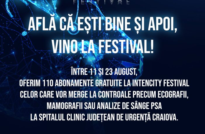 Spitalul Clinic Județean de Urgență Craiova, împreună cu Opera Română Craiova și partenerii PFA Pîrjol Simona Mihaela și SC Eurogenetic SRL, oferă 110 abonamente gratuite la Festivalul IntenCity, celor cărora vor merge în perioada 10-23 august la controale precum ecografii, mamografii sau analize de sânge PSA la sediul SCJU Craiova, din str. Tabaci, nr.1. Programările pentru analizele medicale se realizează între orele 08:00-16:00, de luni până vineri, la numărul de telefon 0751717759 Cancerul de sân și cel de prostată afectează anual mii de oameni, iar prevenția și tratamentul timpuriu te…